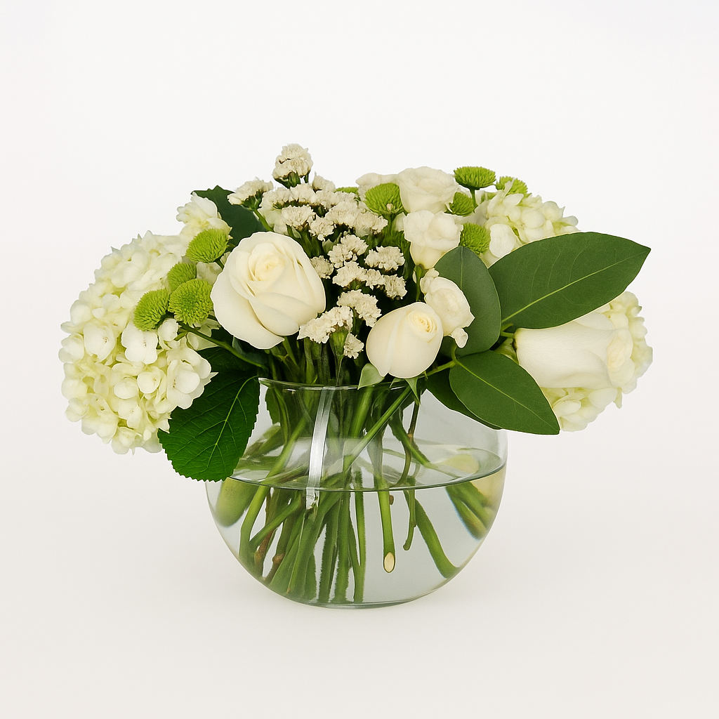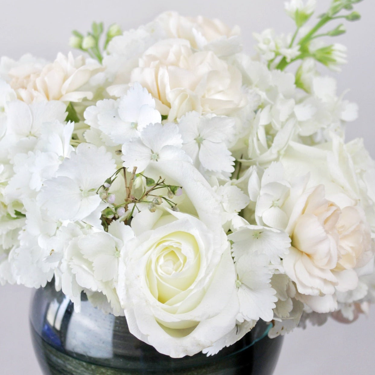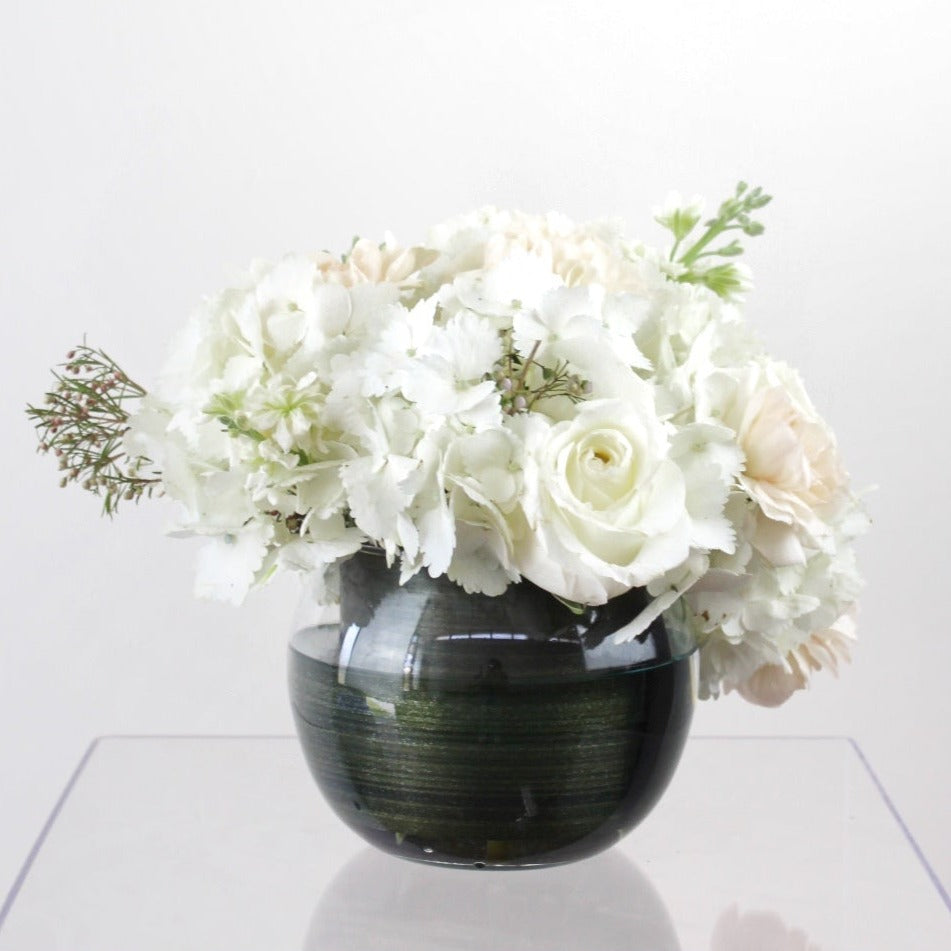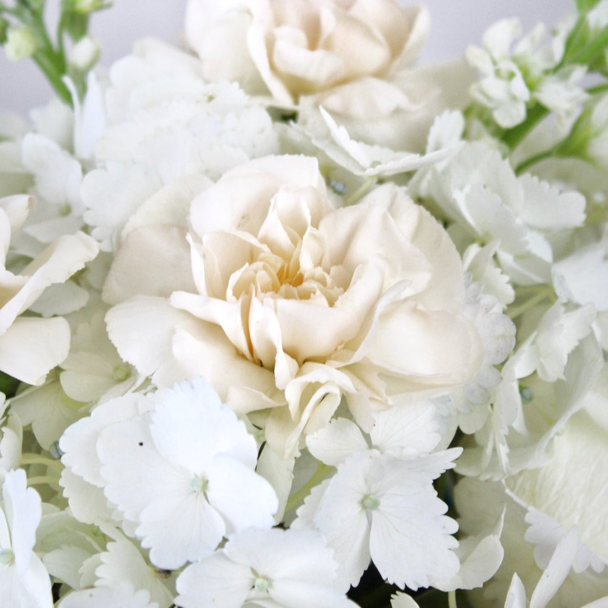 Elegant es una nueva paleta de full blanco. Mix de rosas y claveles acompañado de wax y hortensia con toques de flores silvestres.