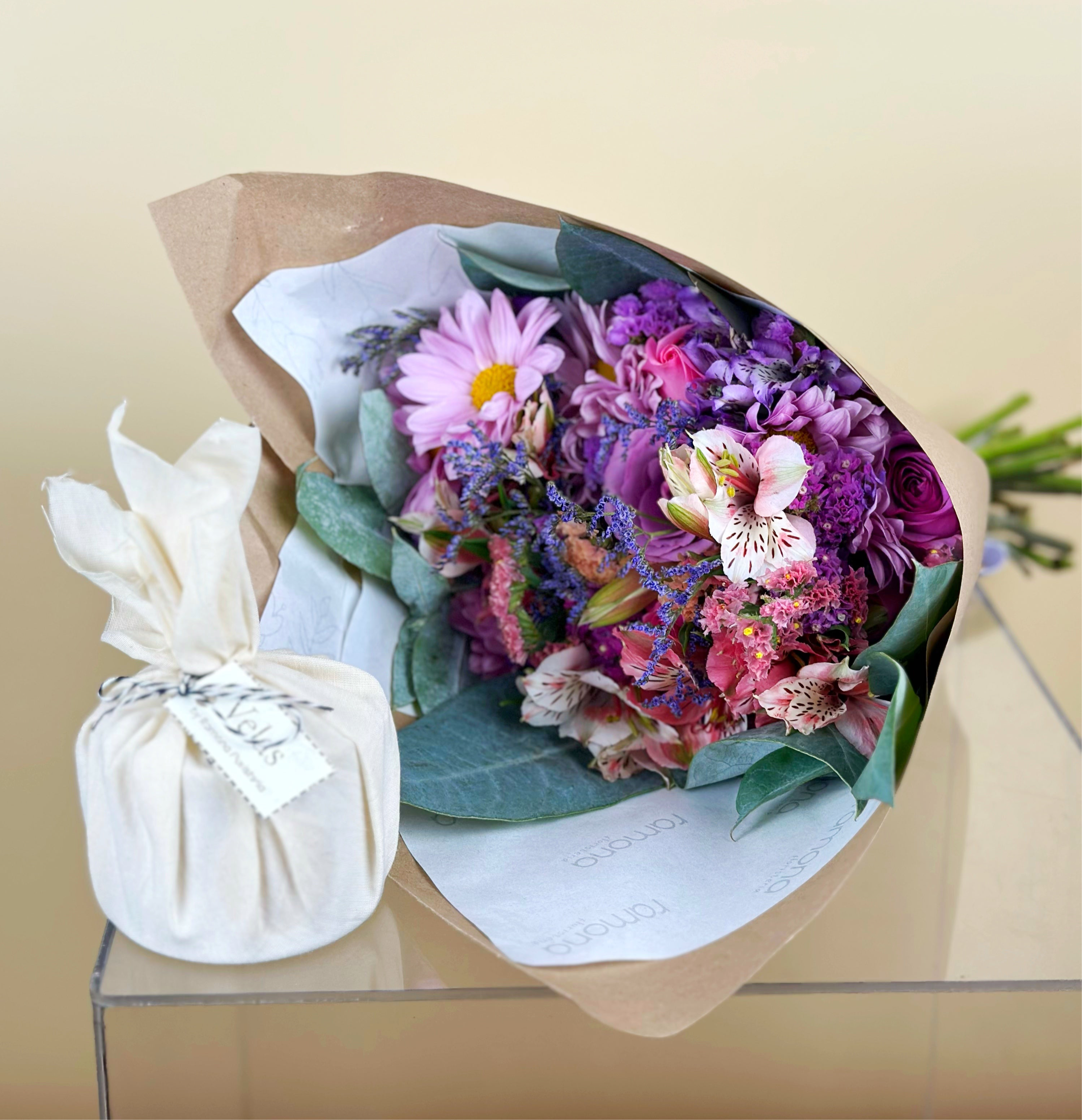 Hermoso ramo de flores entre 18 y 22 tallos, acompañado de nuestras velas aromáticas. Este ramo en en tonos rosados y morado a elección de nuestros florista. Escoge la vela que más te guste. Este producto es ideal para sorprender en un día de cumpleaños