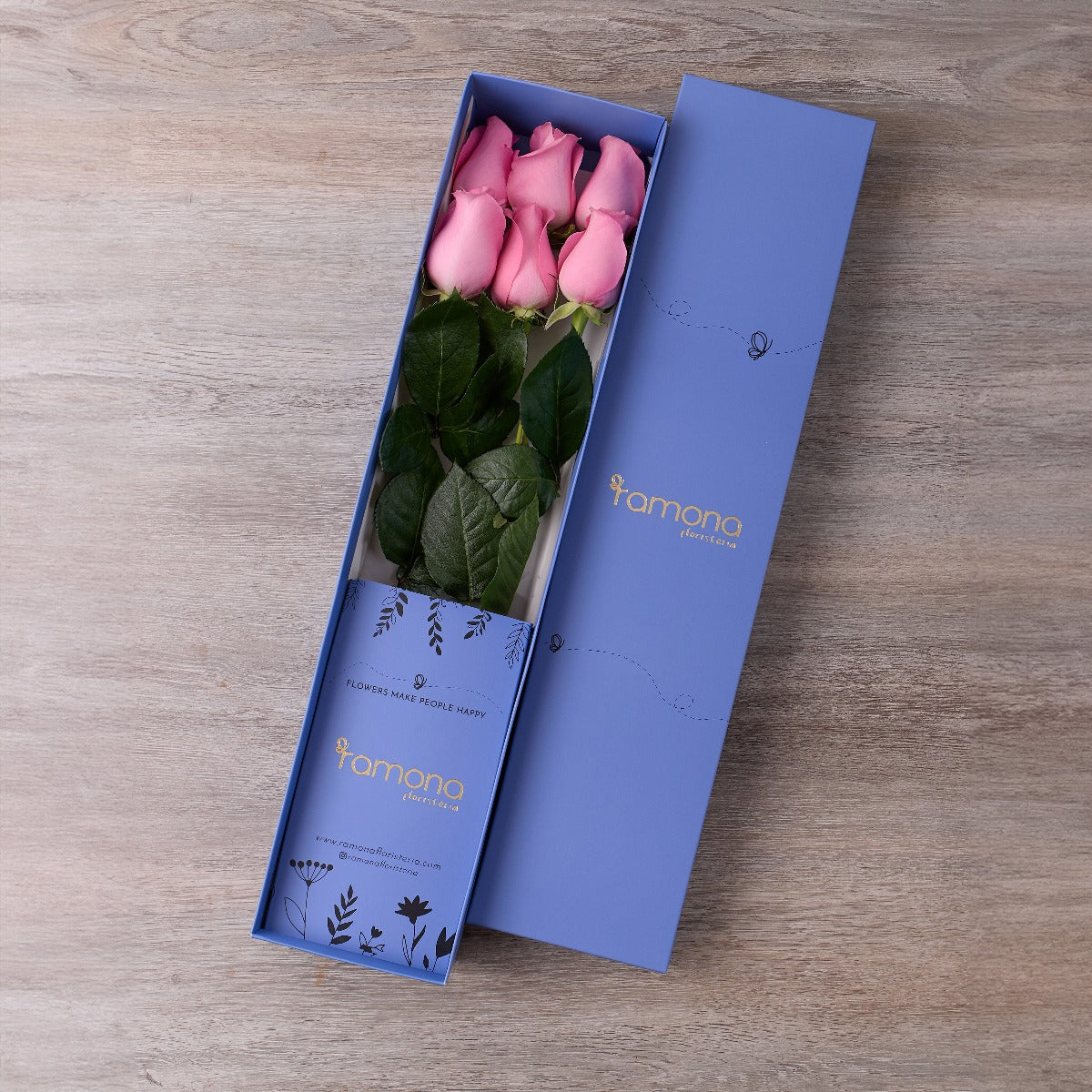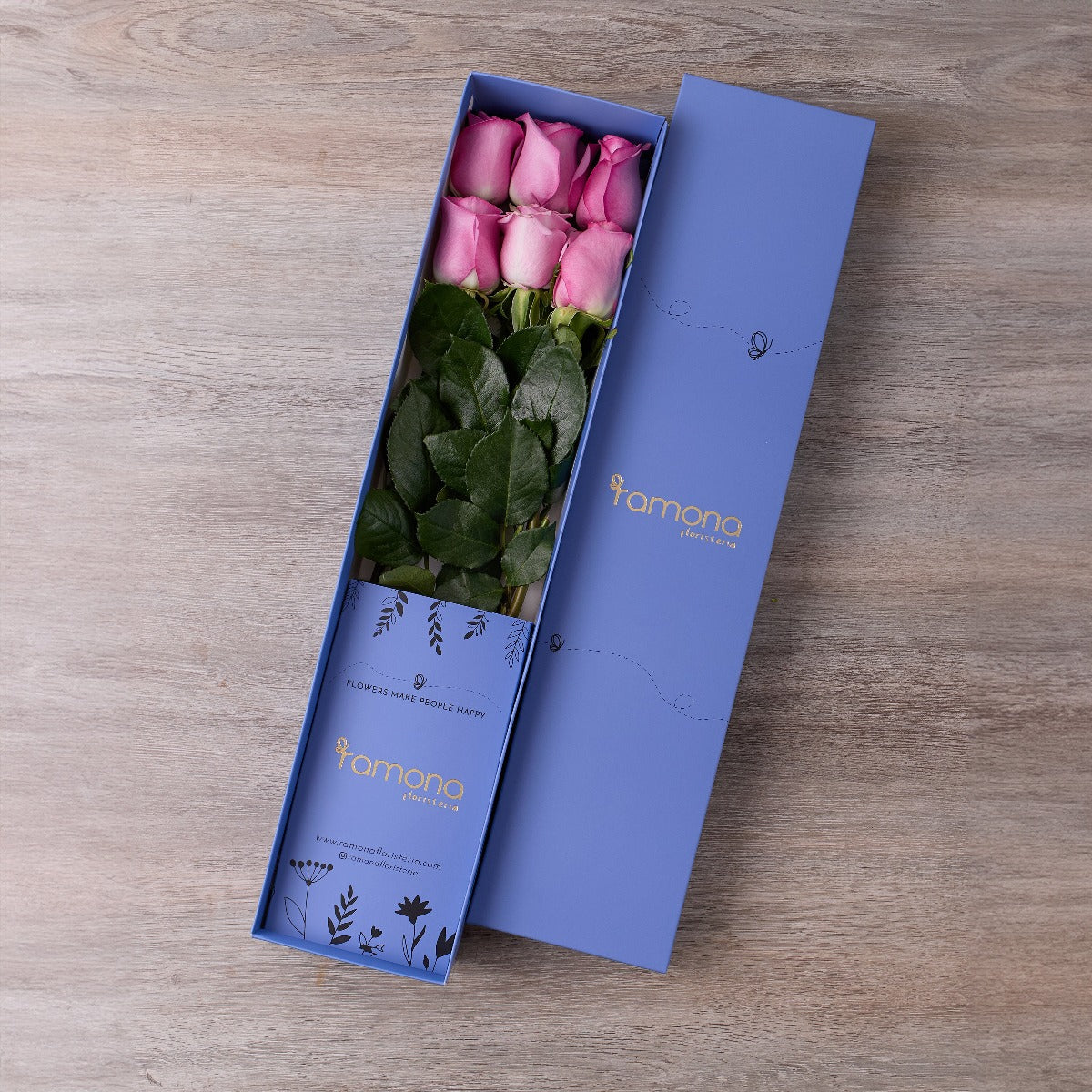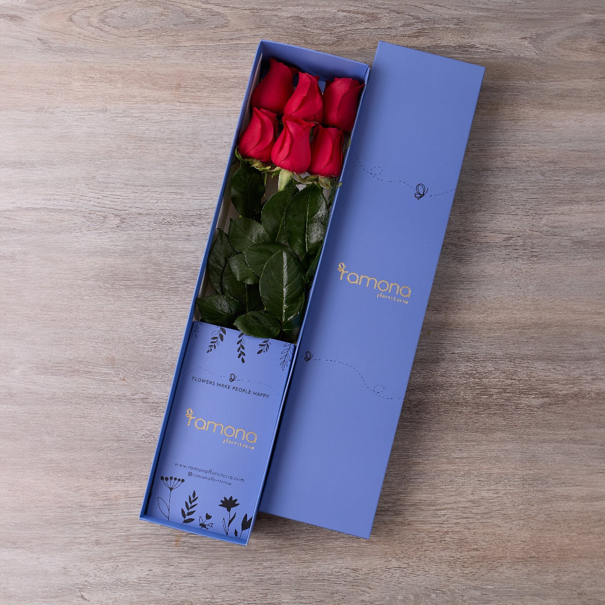 Seis hermosas rosas en nuestra elegante caja. Perfecto para sorprender. Elige el color que más le guste a esa persona especial.