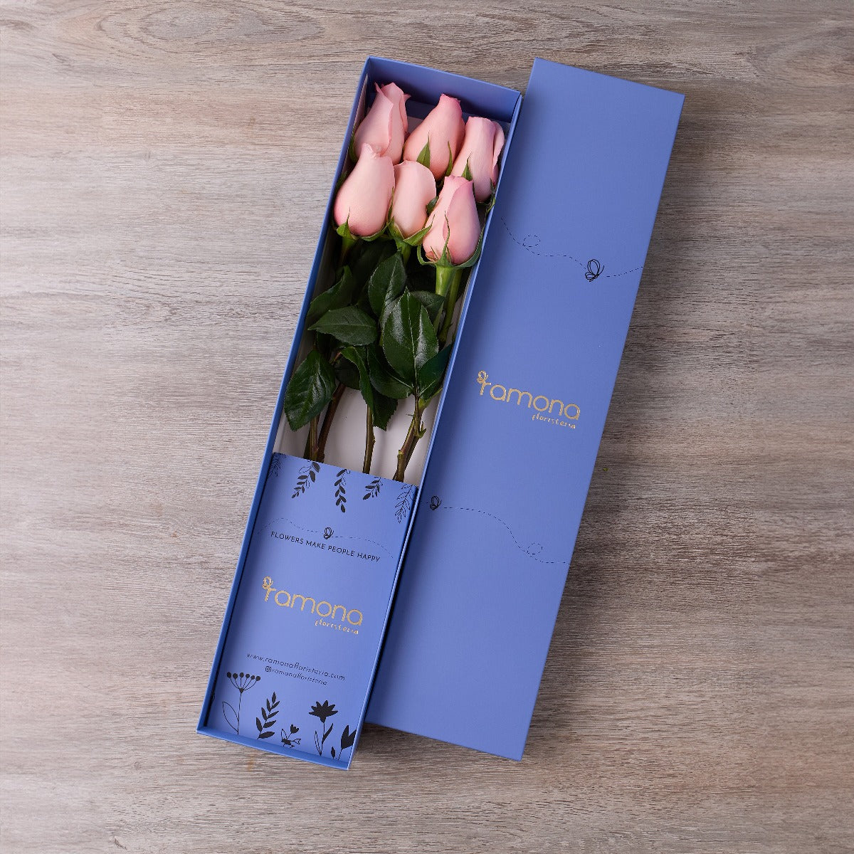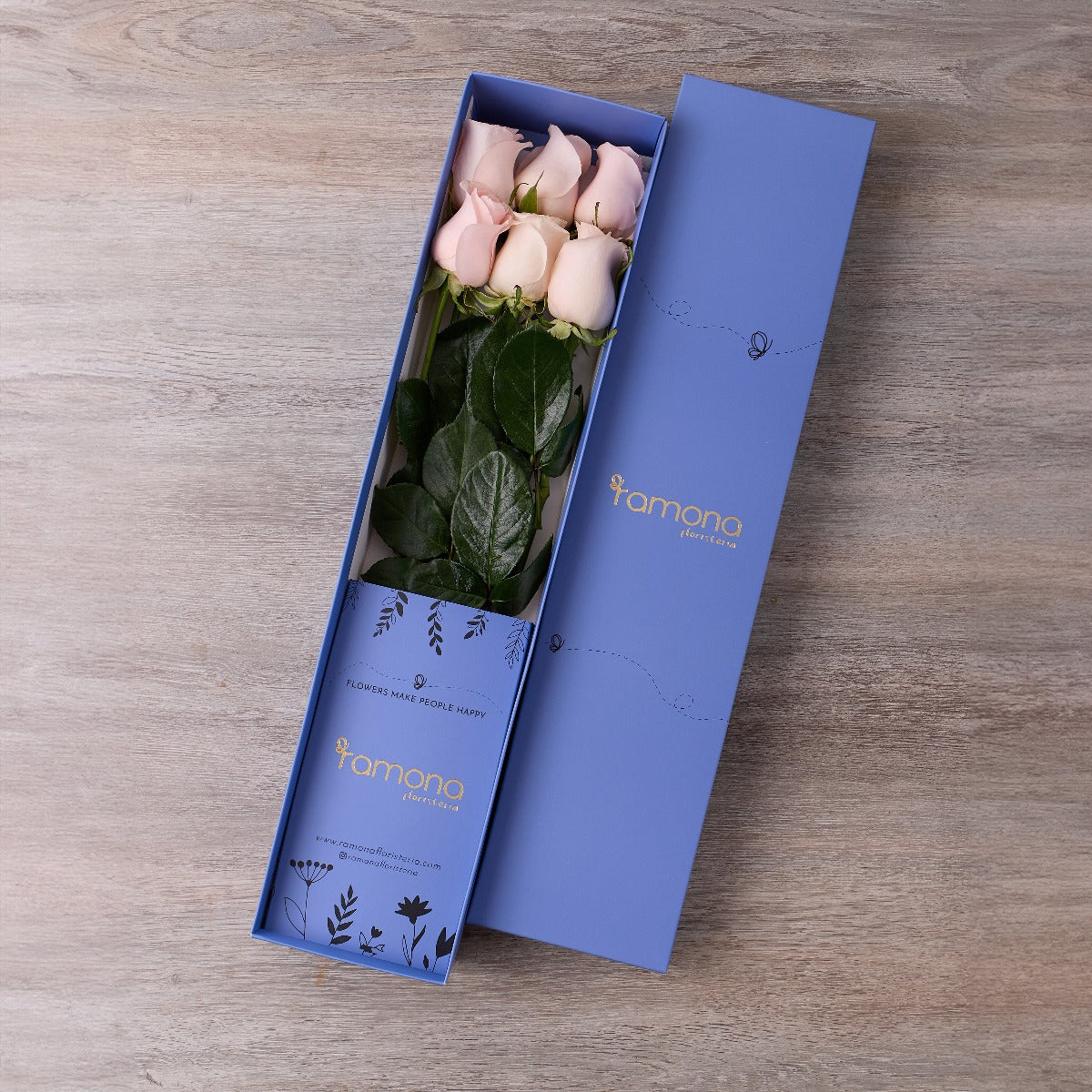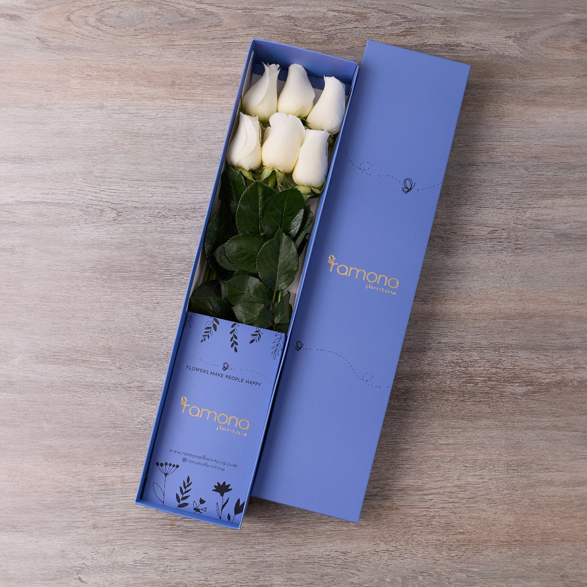 Seis hermosas rosas en nuestra elegante caja. Perfecto para sorprender. Elige el color que más le guste a esa persona especial.