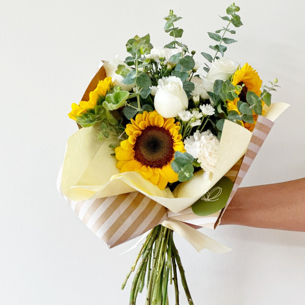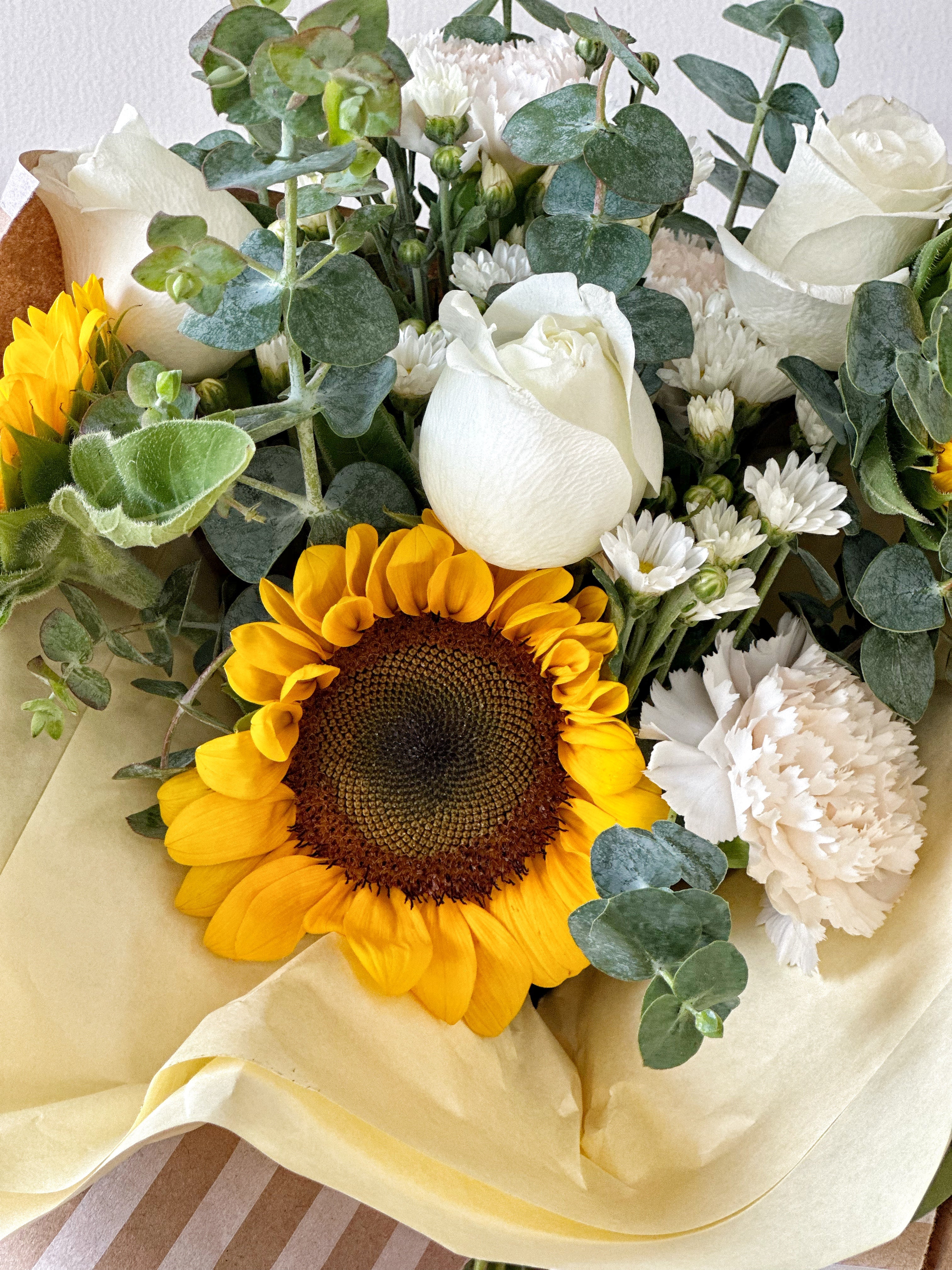 Ramo de girasoles con rosas blancas eucalipto y mini margaritas.