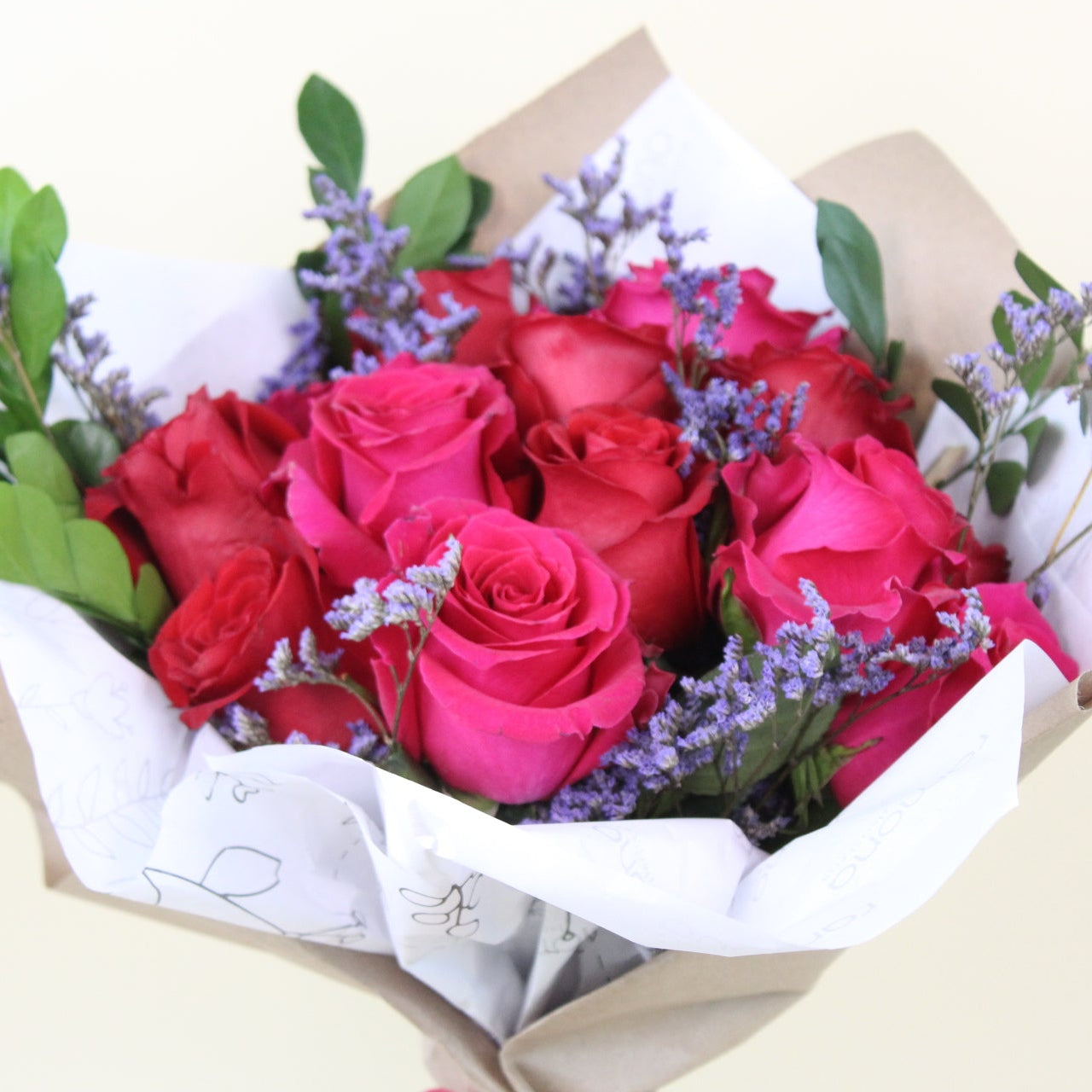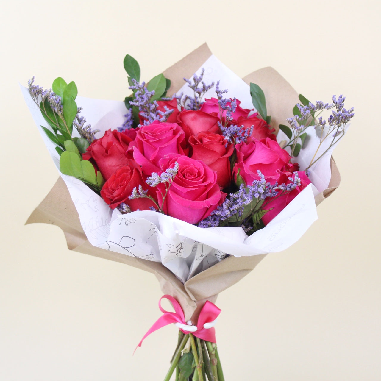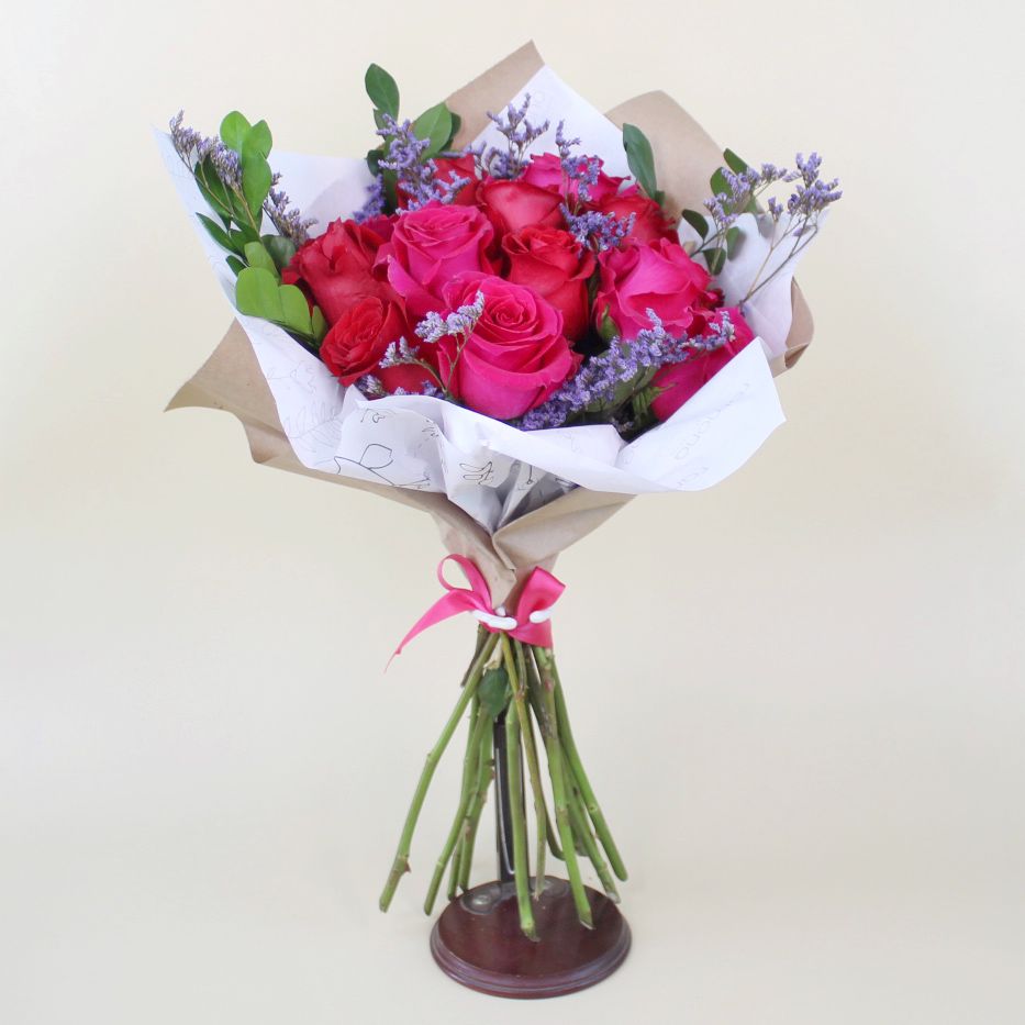 Un clásico con actitud. Este ramo está compuesto por 12 rosas en tono fucsia y rojo intenso, realzadas con toques delicados de limonium lila y follajes verdes frescos que aportan textura y equilibrio visual. Envuelto en papel kraft y papel ilustrado, terminado con un lazo satinado, es una propuesta elegante y moderna a la vez.