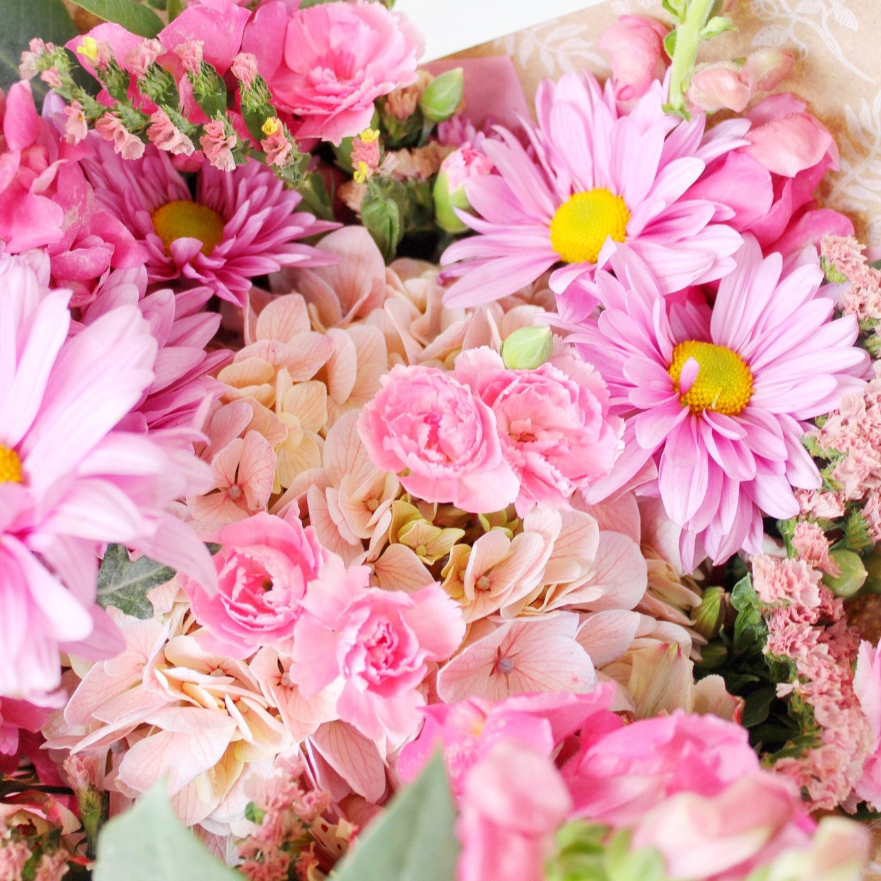 Este ramo es pura diversión floral. Con hortensias, crisantemos, dogos, claveles y statice rosados, es una explosión de alegría y color. El regalo perfecto para contagiar sonrisas.